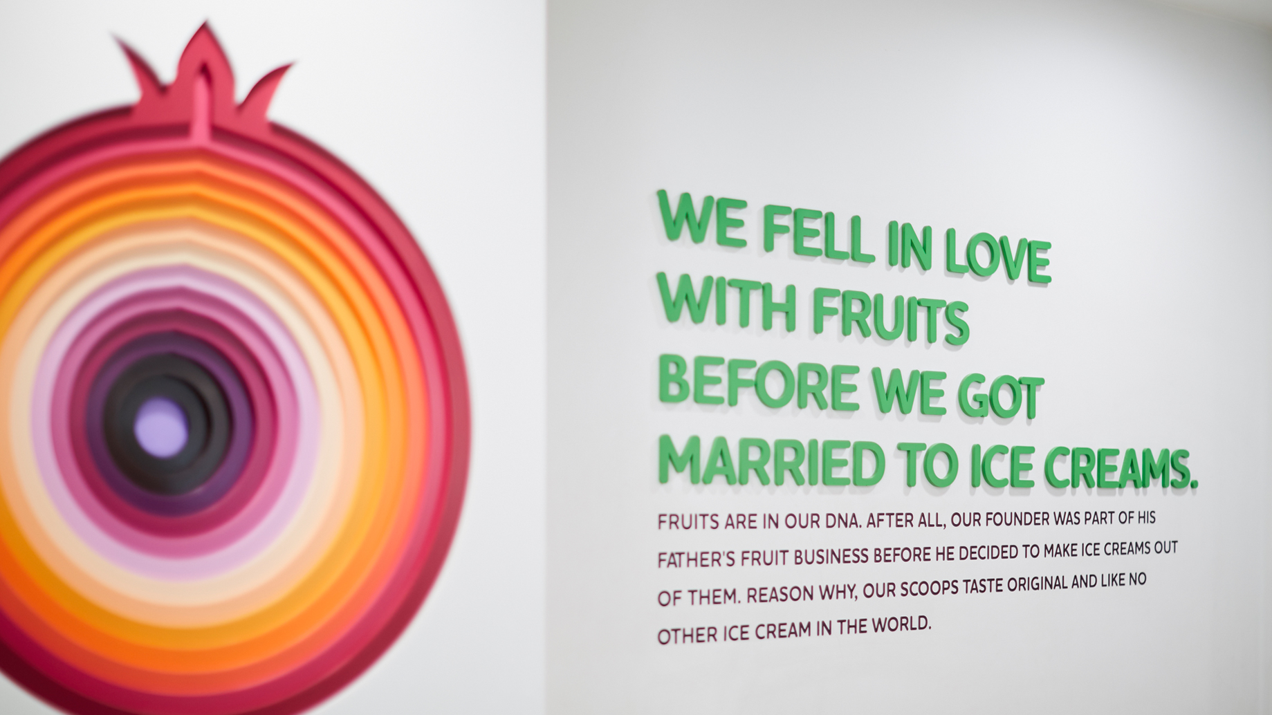 In the art district of Delhi we decided to approach our outlet as nothing short of a piece of art. Only difference being our art and installation boasted of lots of colours and were essentially inspired from fruits. The dash of brightness and colours can’t be missed when you step into this little ice cream parlour amidst great many art shops of Delhi.