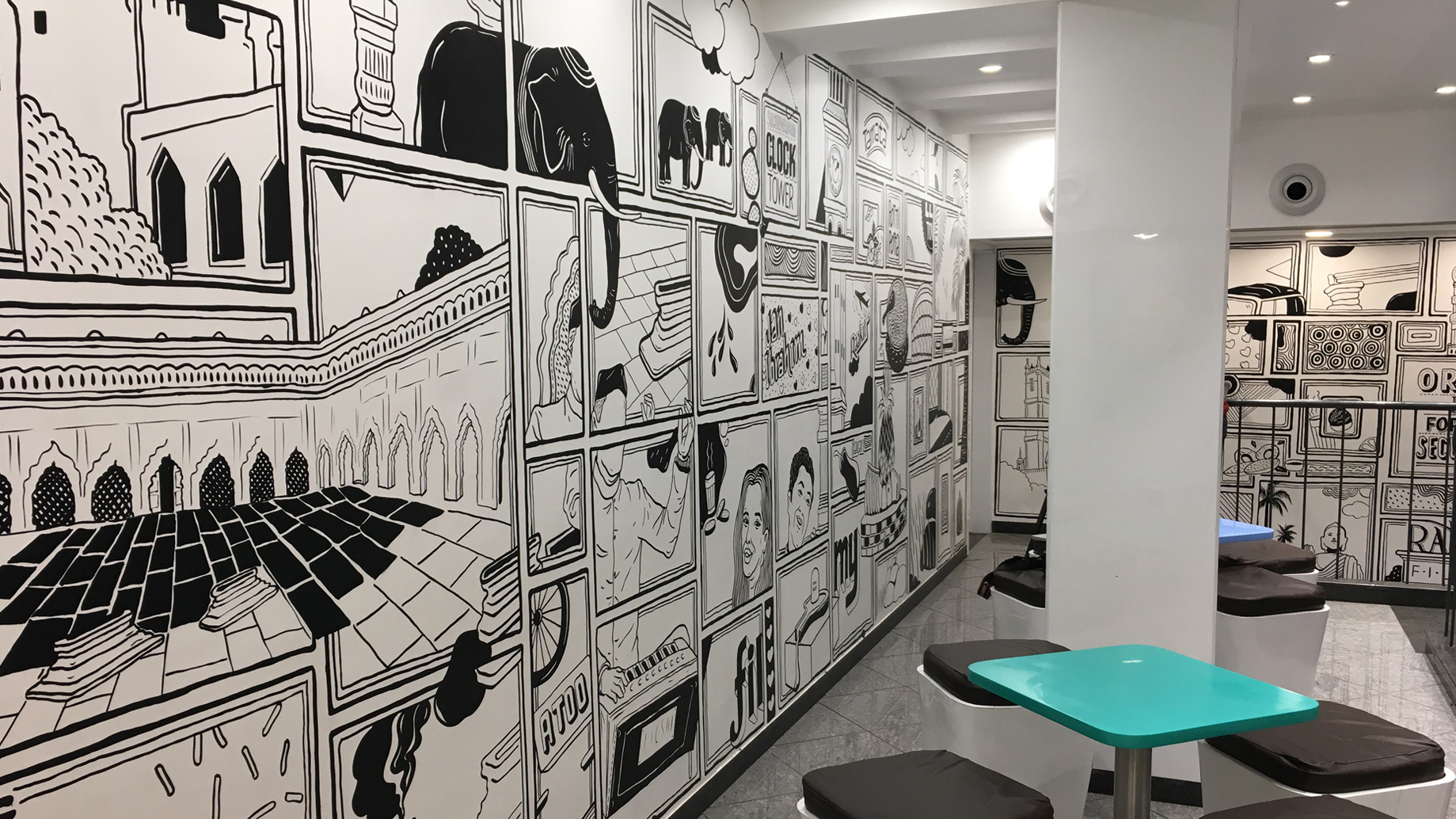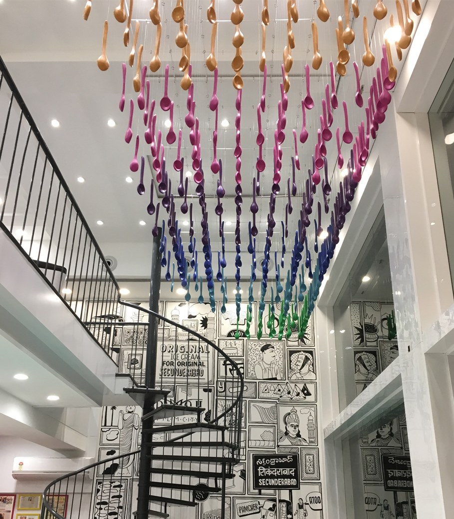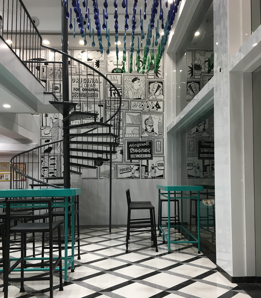 The outlet wears its love for Secunderabad on its walls. Hand painted on the walls of the outlet you will find the culmination of local history and some of its milestones. A milestone for us too in our world of space design.